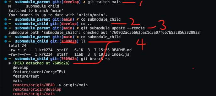 - child repo의 변경 사항을 그 자신의 원격에 업데이트 하지 않은 경우, parent 상태 자체가 꼬일 수 있다. (4번 참고)