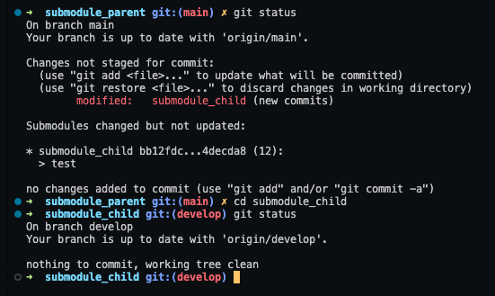 서브모듈은 결국 2개의 repository를 사용하기 때문에 parent에서 child를 변경 시에도 child의 git 상태가 변경됩니다.